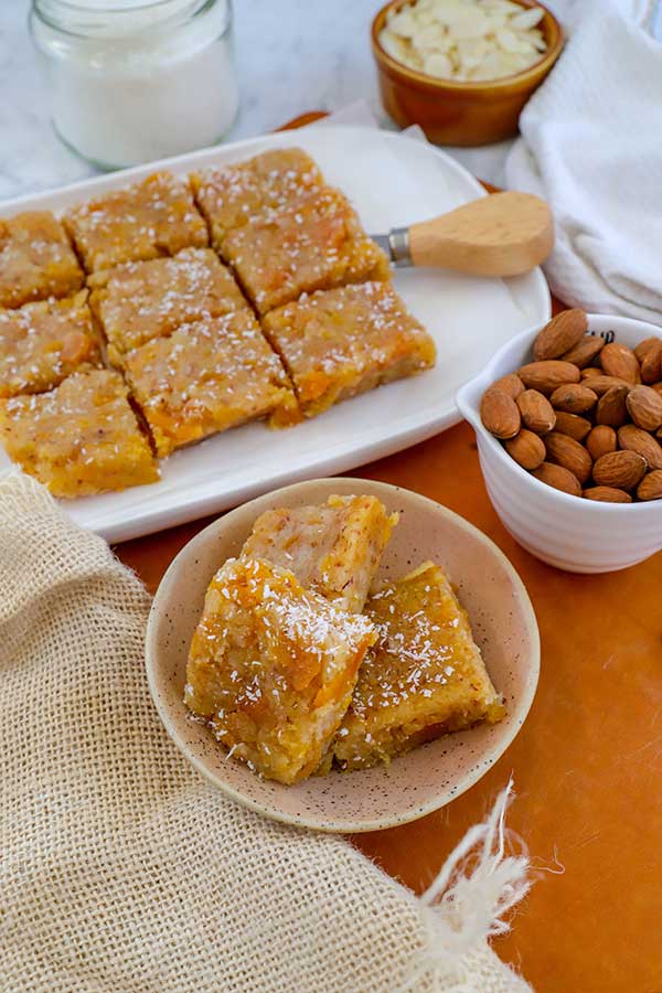 3. Transfer to a medium mixing bowl and stir in the flaked almonds. Add mixture to pan and press down firmly. Please leave in fridge for roughly 1 hour to firm. When ready to serve, slice into 14 pieces.