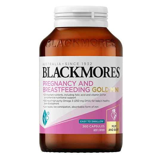 Blackmores Pregnancy & Breast-Feeding Gold Mini provides 20 essential nutrients, including folic acid to help prevent neural tube defects and vitamin D3 to support maternal health during pregnancy and breastfeeding.