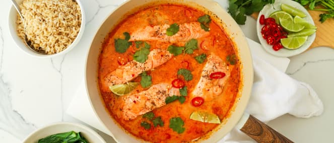 Bring vibrant flavours to the dinner table with this one-pan Thai coconut salmon, where tender fillets gently simmer in a fragrant sauce infused with chilli, lime, and lemongrass. Salmon is naturally rich in omega-3 fatty acids—essential fats that help to fight inflammation, support cognitive health, and promote healthy blood flow. These powerhouse nutrients are also linked to improved mental health, skin, and joint function, making salmon a true superfood. Pair this dish with high-fibre brown rice and steamed Asian greens for a well-balanced meal that comes together in under 30 minutes.