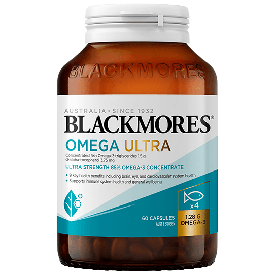 Blackmores Omega Ultra is a high-strength fish oil providing 1.5 g of concentrated omega-3 triglycerides and 3.75 mg of d-alpha-tocopherol +…